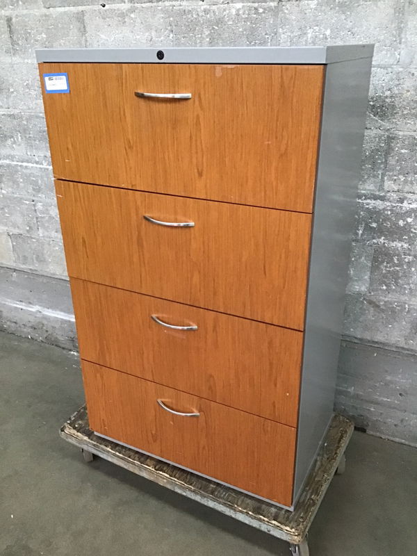 Here we have a solid HEAVY metal storage cabinet with wooden drawer faces for a handsome look. Four drawers, painted black inside and a light gray paint job on the outside.