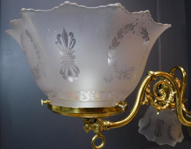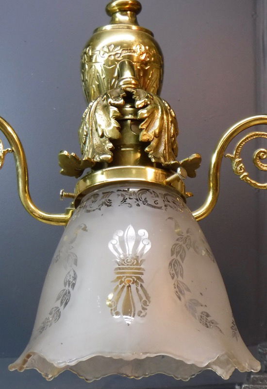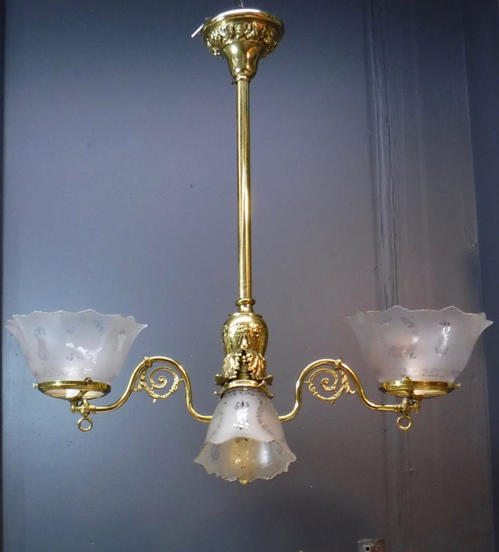 An antique gas/electric transitional chandelier from the early part of the 20th Century that has been fully udated to electric. Has four etched glass shades with a laurel wreath design. At some point in it's life, it looks as though it was refinished, and some parts soldered. More recently, all of the socket and wires were replaced. By me. Upstairs in our onsite light workshop.