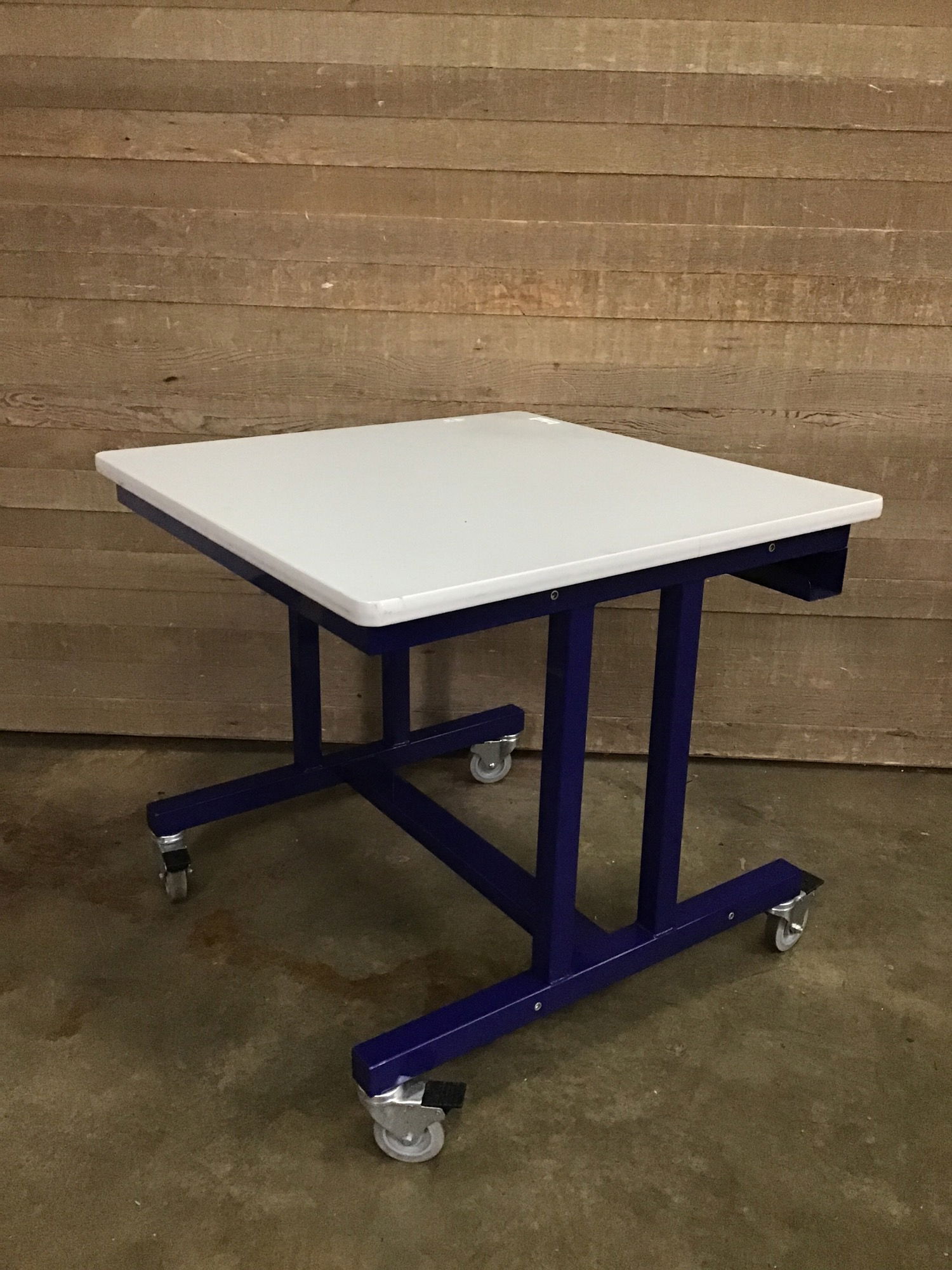 3' square mobile work table with sturdy plastic top and steel base on four swivel casters with locks in good used condition. Retails new for $500+.