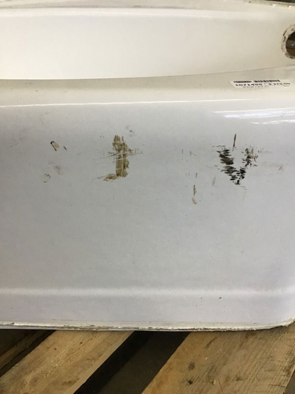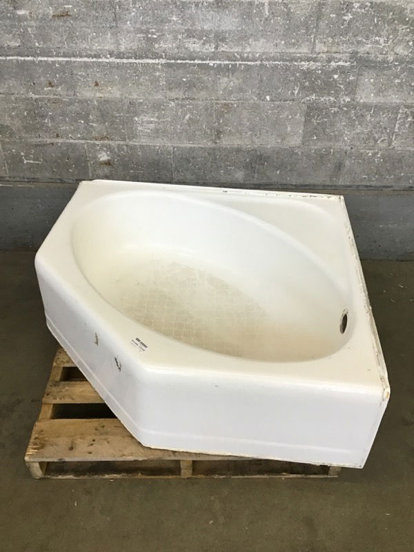 Petite cast iron corner bathtub with a 48" x 30" basin. It's got some scuffs on the apron and some leftover schmutz along the back edges from its previous installation, but there are no chips or wear around the drain.