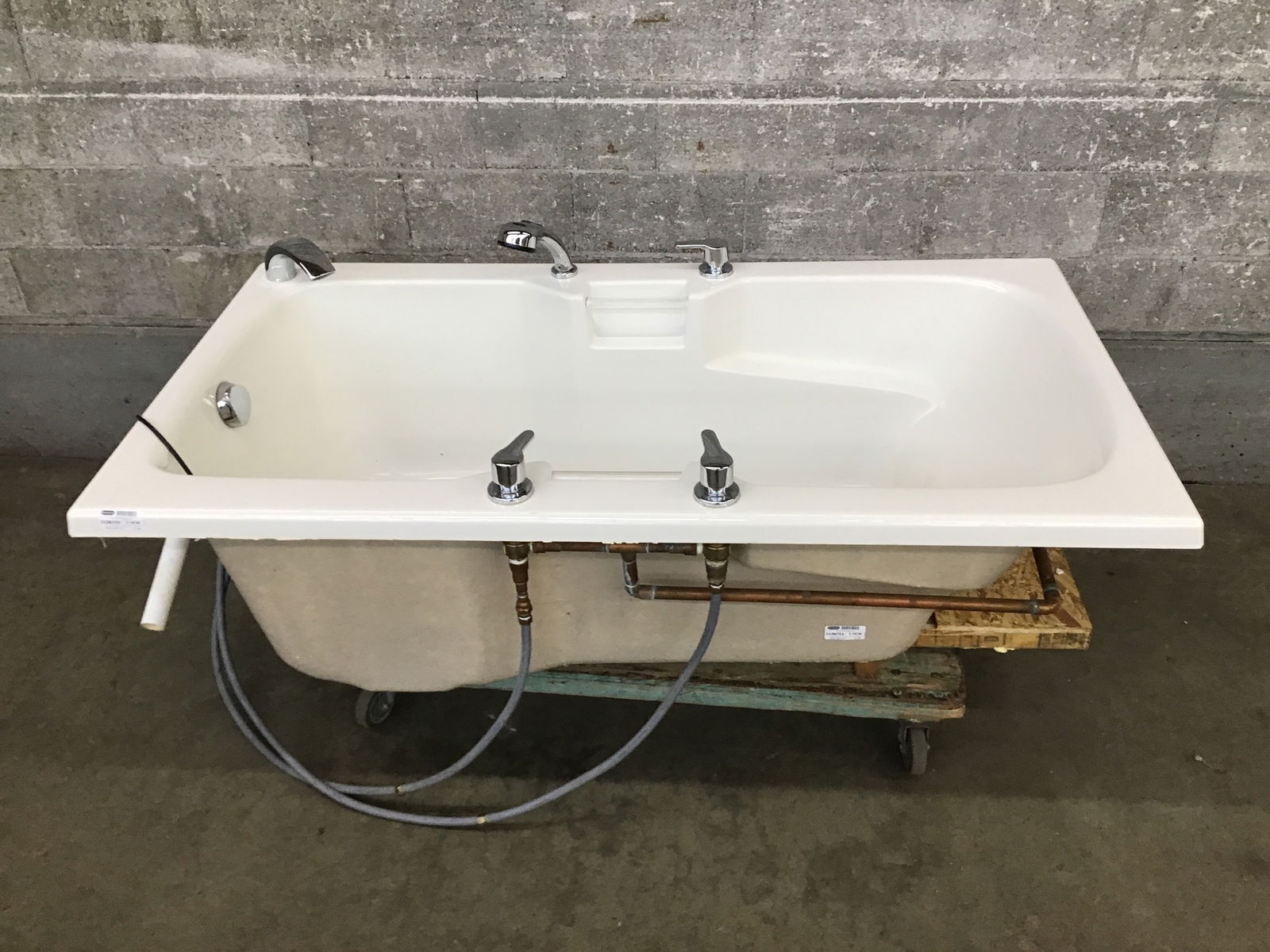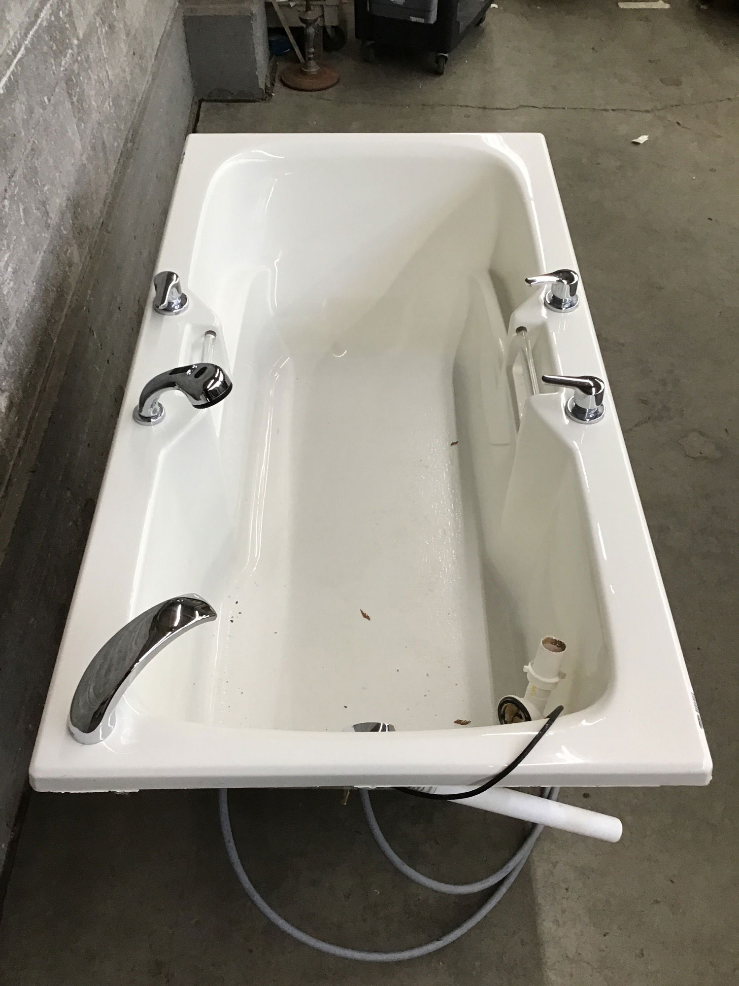 Luxurious fiberglass soaker tub by Hydro Swirl. The chrome hardware includes a tub filler and a hand shower. Looks to be free of scratches and dings.
