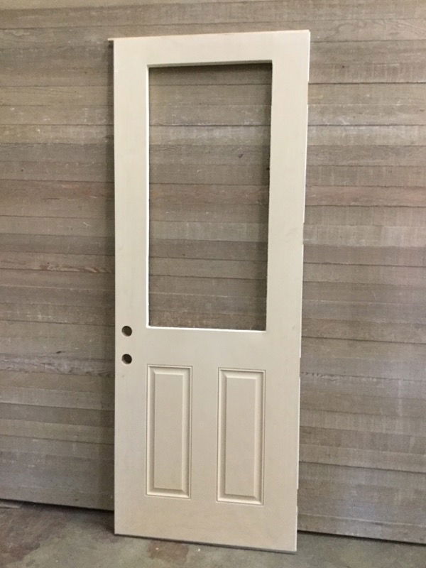 Overheight fiberglass half lite SANS GLASS! Faux wood grain texture, painted some variety of beige.