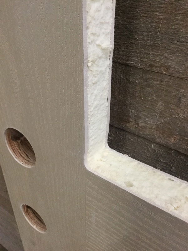 Overheight fiberglass half lite SANS GLASS! Faux wood grain texture, painted some variety of beige.