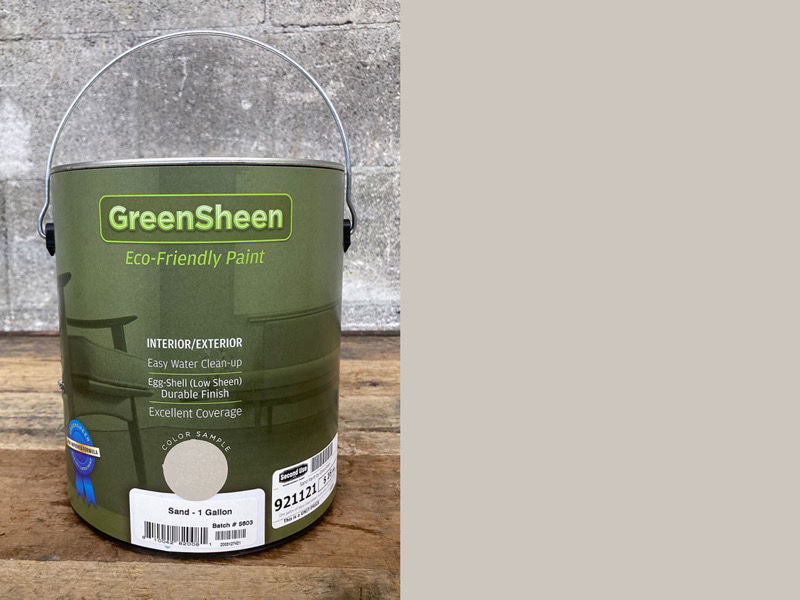 One gallon of Sand GreenSheen house paint. GreenSheen paints are made from 100% reclaimed materials. They process the paint that Washington residents recycle with the PaintCare program! GreenSheen is a quality eggshell finish paint that is available in a wide range of colors and costs much less than traditional paints. Their reclamation and cleaning process produces an interior/exterior house paint that is naturally lower in VOCs and provides exceptional coverage and durability. Check out our full selection of 18 different colors, available in one or five gallon sizes. Learn more about GreenSheen here. Please note, this is a bulk item and cannot be placed on hold.