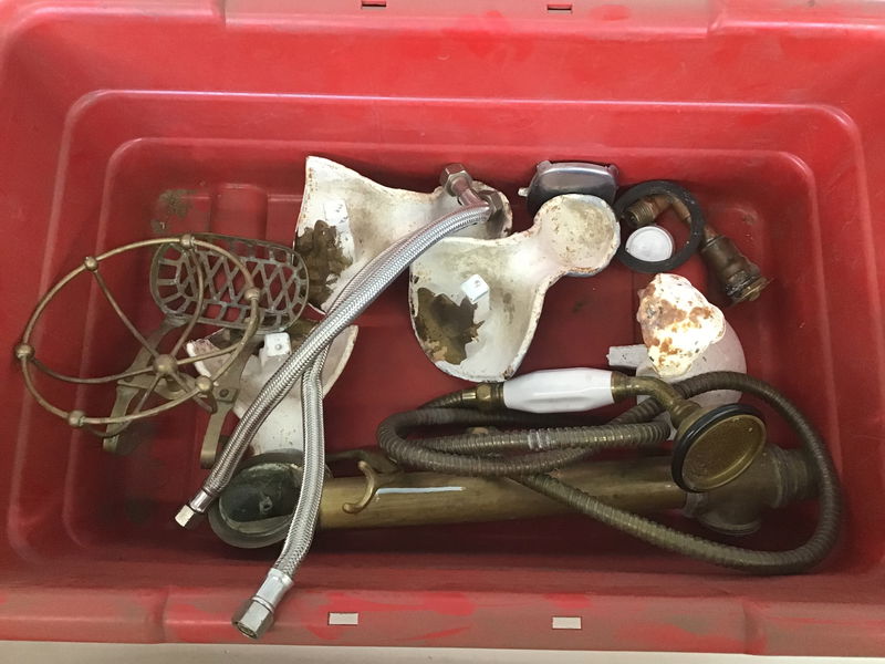 Vintage 5ft clawfoot tub that comes with pretty much all it's original accessories. Comes with brass drain assembly, telephone hand shower, even a soap and sponge caddy. The tub itself has some chips here and there, but is still in usable condition.