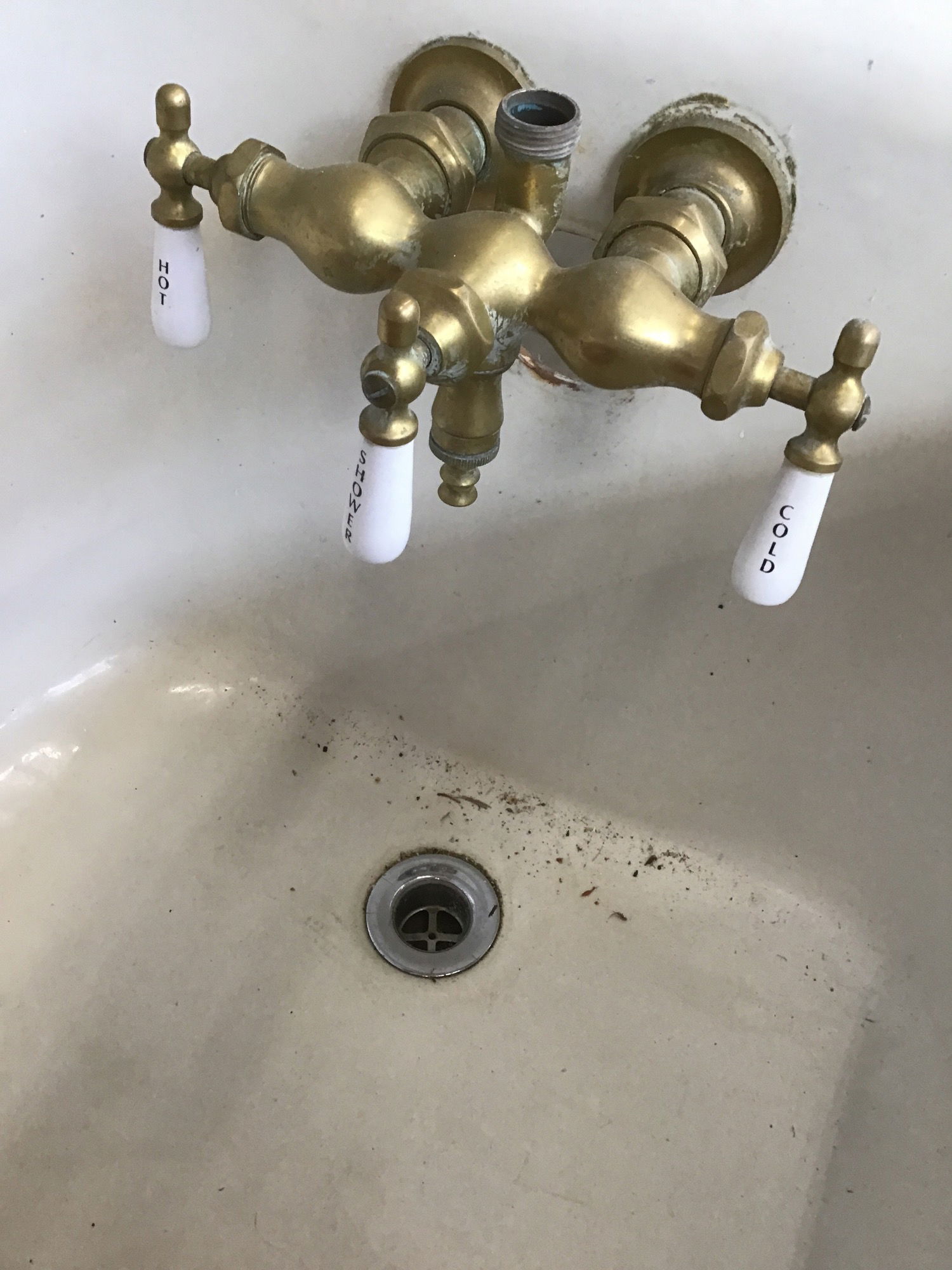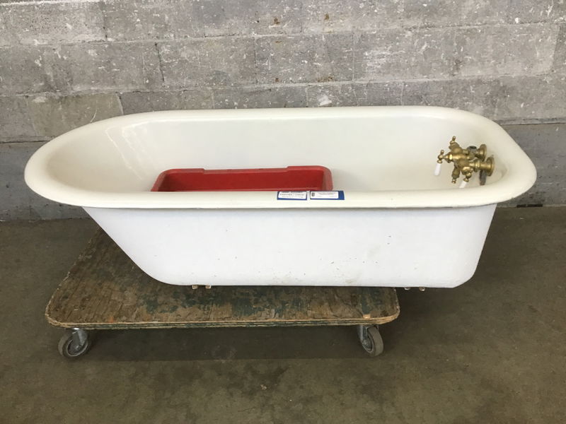 Vintage 5ft clawfoot tub that comes with pretty much all it's original accessories. Comes with brass drain assembly, telephone hand shower, even a soap and sponge caddy. The tub itself has some chips here and there, but is still in usable condition.