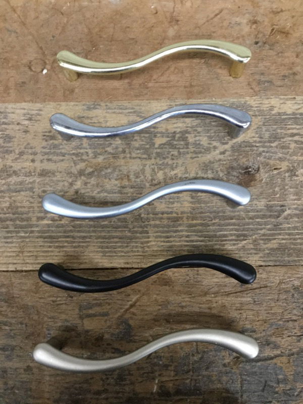 Multi-colored solid brass pulls with a little wave / curve to them. Needs screws. 5" center-to-center. Changing out hardware is a great and easy way to refresh any furniture piece!