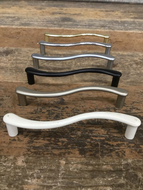 Multi-colored solid brass pulls with a little wave / curve to them. Needs screws. 5" center-to-center. Changing out hardware is a great and easy way to refresh any furniture piece!