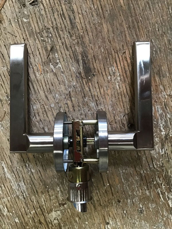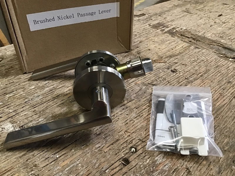 Sleek modern lever set (passage), brushed nickel finish; contractor surplus, new in box, all wrapped up. Left or right hand swing // reversible. No brand name to be found, but they seem to be nice quality - have some heft to them and the finish looks good. This is a bulk item and cannot be placed on hold -- come down to the shop to get yours!