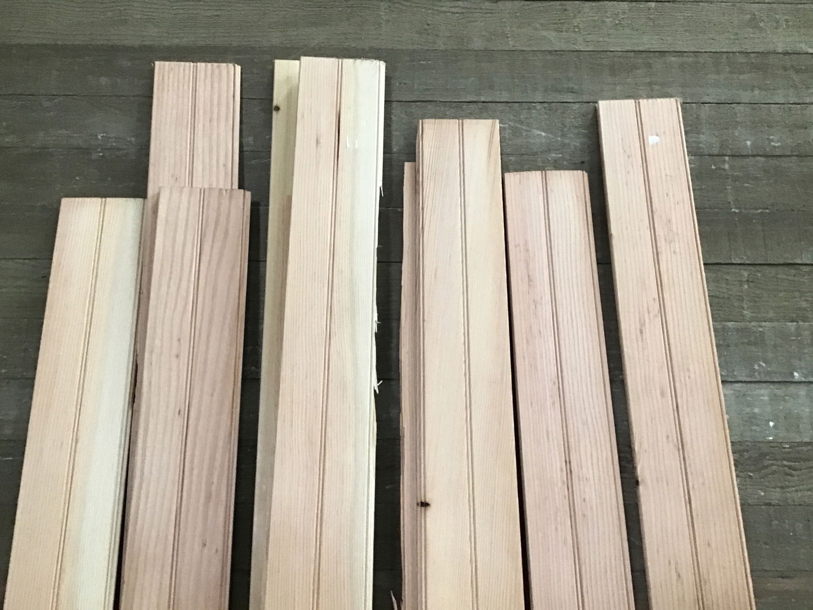Lot of approximately 68 linear feet of 5-1/8" Fir beadboard newly milled in the PNW. One side is beaded, the other has a v-groove. Some D-grade vertical grain, some clear mixed grain, a few have small knots. Lengths vary from 7-1/2' - 8'.
