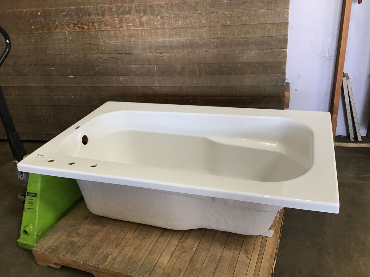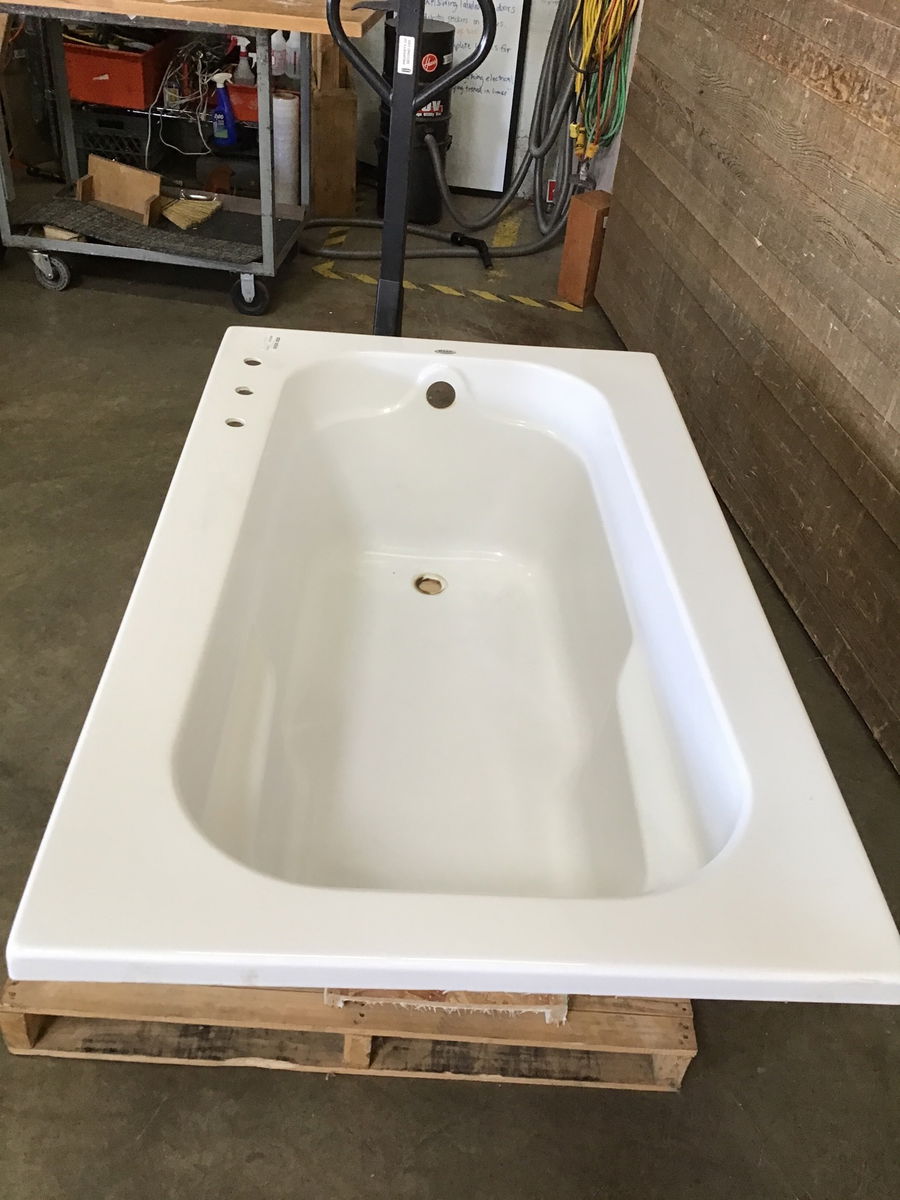 Maax rectangular drop-in soaker tub. It looks like it's been gently used, though there's a little residue around the drain and some scuffs near the faucet holes. Looks to be in overall great condition. Similar models retail for upwards of $1100, which you can see here