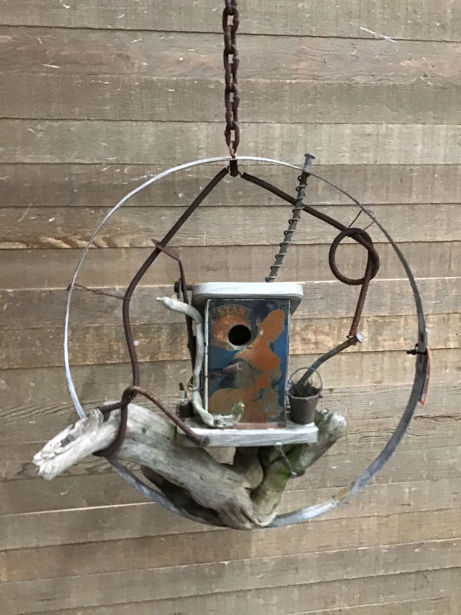 Functional birdhouse sculpture with a shabby, folky look.