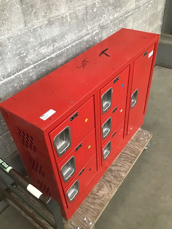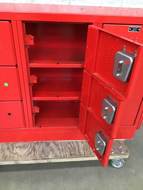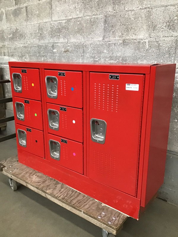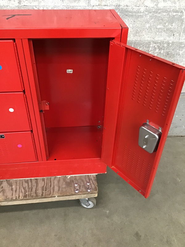 Seven door bank of lockers from the Newport H.S. (Bellevue) gym . These are pretty clean looking. The large door on the right is 12 3/4" x 26 3/4". The smaller doors are 12 3/4" x 8 3/4". These are great units for garage, shop, employee break rooms, or even as part of a kitchen island. Item may have cosmetic damage. Photo may be representational.