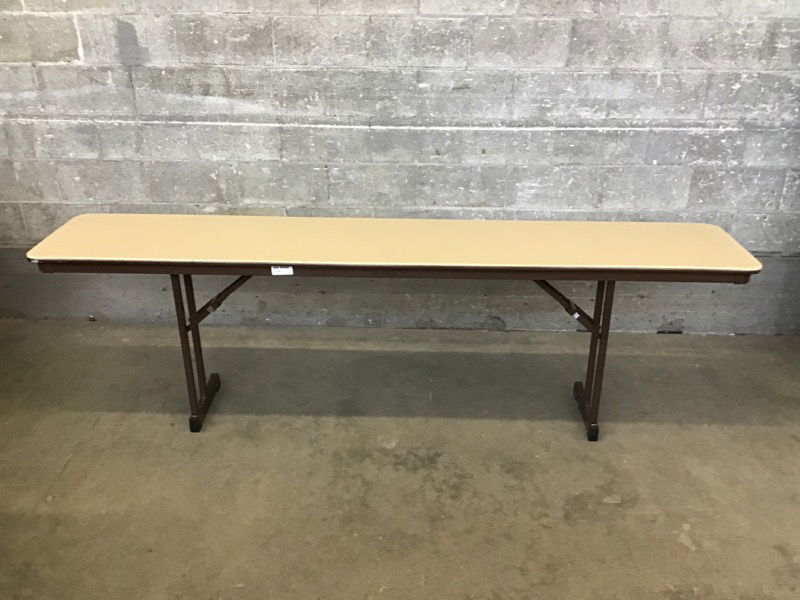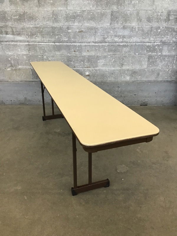 Sturdy, long, and narrow folding seminar table made with ABS plastic by Mity-Lite. This would be perfect for a small workspace. Tabletop is beige, legs are brown. The top and sides have some scuffs and scratches to the finish but overall this thing is in great shape. Retails new for $400. Photo may be representational.