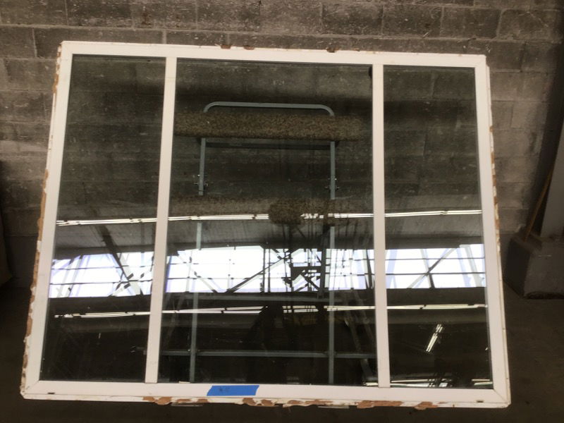 Large fixed window in a white vinyl. Nailing fins are a little bit in rough condition but the overall window is in good condition.