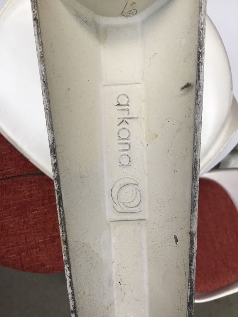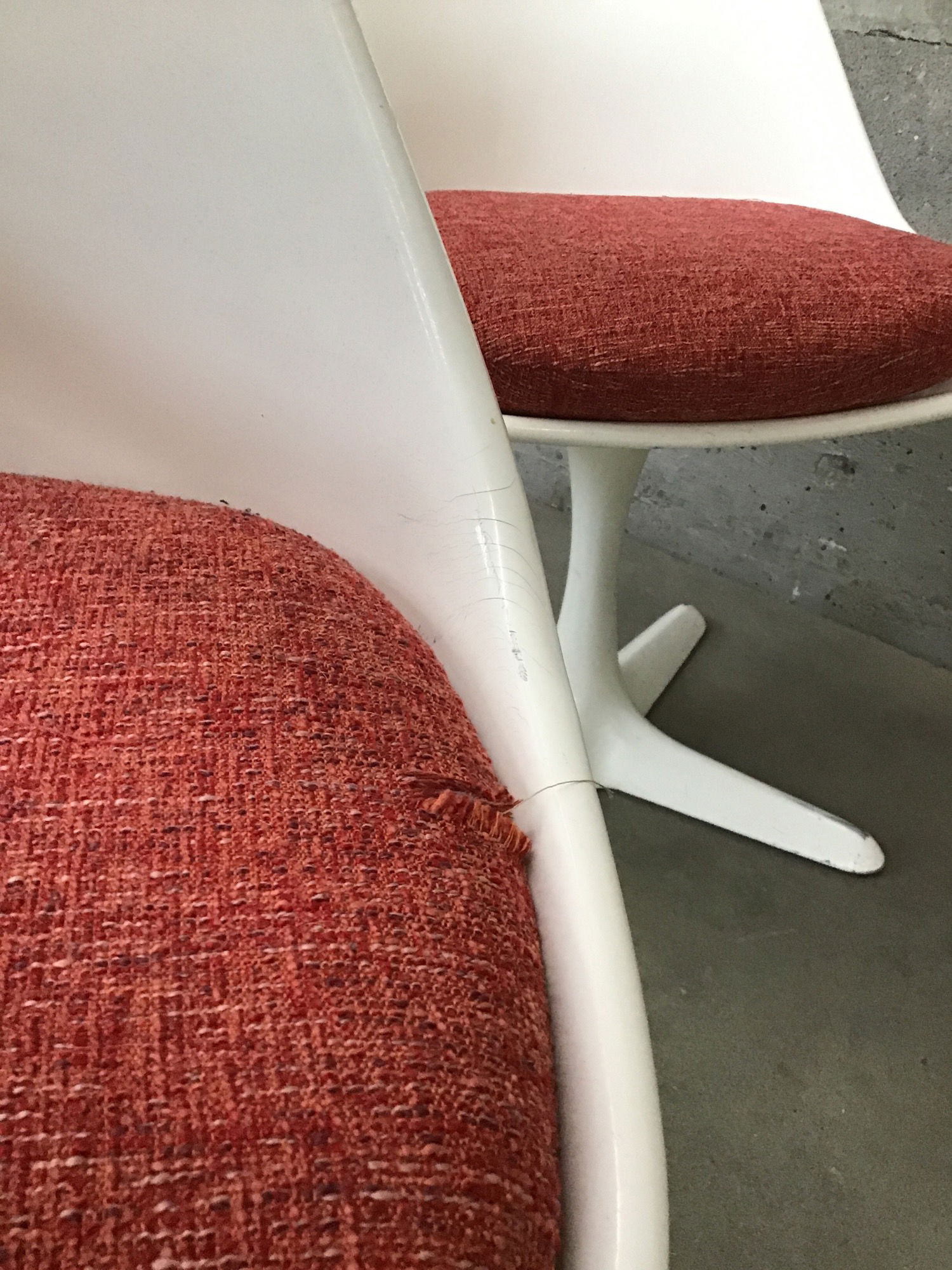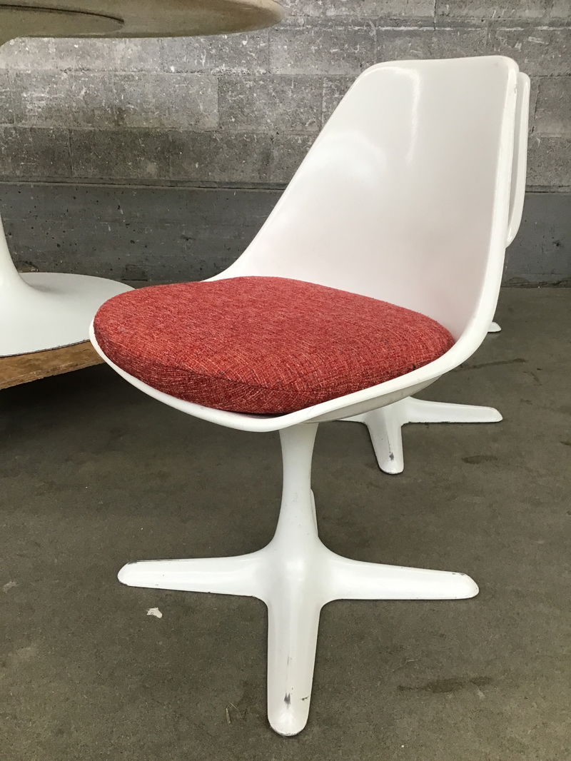 Made in the 1960s, this mid-century modern Arkana tulip table features a cast aluminum base, a white finish, and a particle board top with a laminate finish. The table also includes six chairs, each with a cast aluminum base, fiberglass seat and woven red cushion. Some light scratches across the set. Some chairs are missing rivets. These tables alone sell for $2,000+ online. Priced to reflect wear.