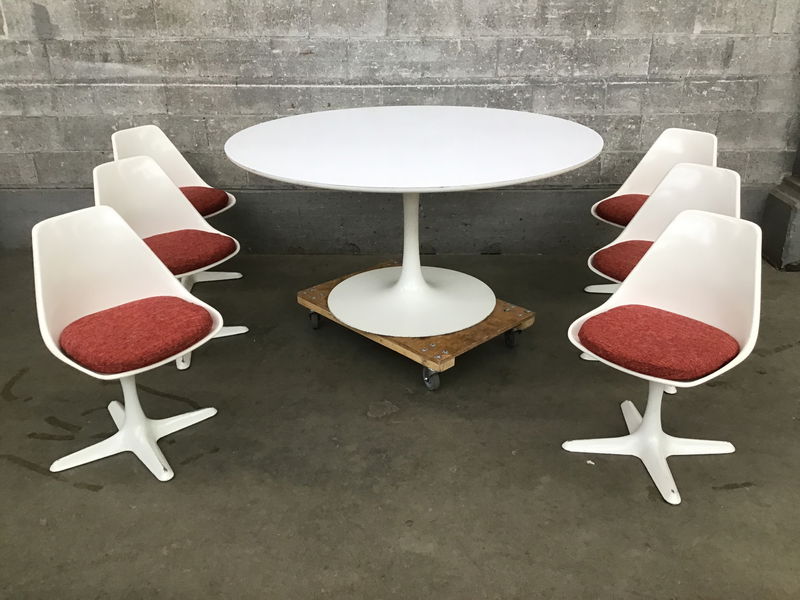 Made in the 1960s, this mid-century modern Arkana tulip table features a cast aluminum base, a white finish, and a particle board top with a laminate finish. The table also includes six chairs, each with a cast aluminum base, fiberglass seat and woven red cushion. Some light scratches across the set. Some chairs are missing rivets. These tables alone sell for $2,000+ online. Priced to reflect wear.