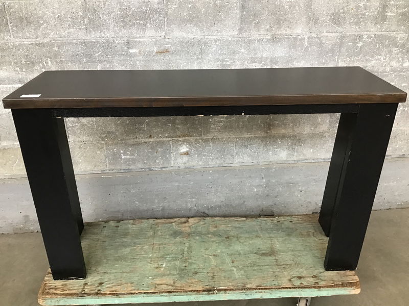 This modern styled bar height table has an interestingly oriented black base and a moody laminate top with a dark stained wooden border. There are some scratches and scuffs, mostly on the base, from previous use.