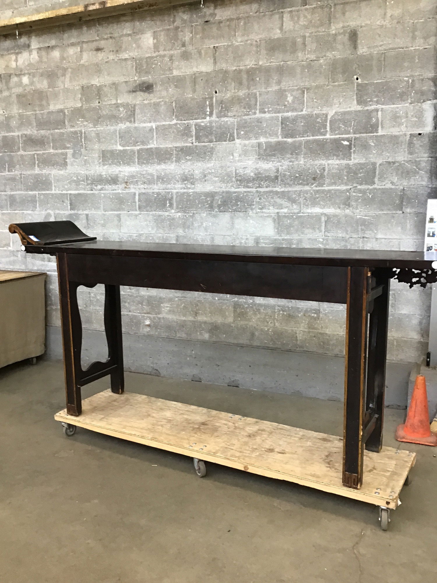 This interesting bar of sorts was previously used in a production at the 5th Avenue Theatre and is now ready for a more permanent home. Some of the distressed gold finished trim is missing or damaged, but for the most part this is a pretty nice looking piece with minimal wear and tear. There is a curvy piece of trim on one end (adds 6" to listed height) - it looks like there may have been a matching piece on the other end at some point. Could be a nice bar height table for extra tall friends or extra tall bar stools.