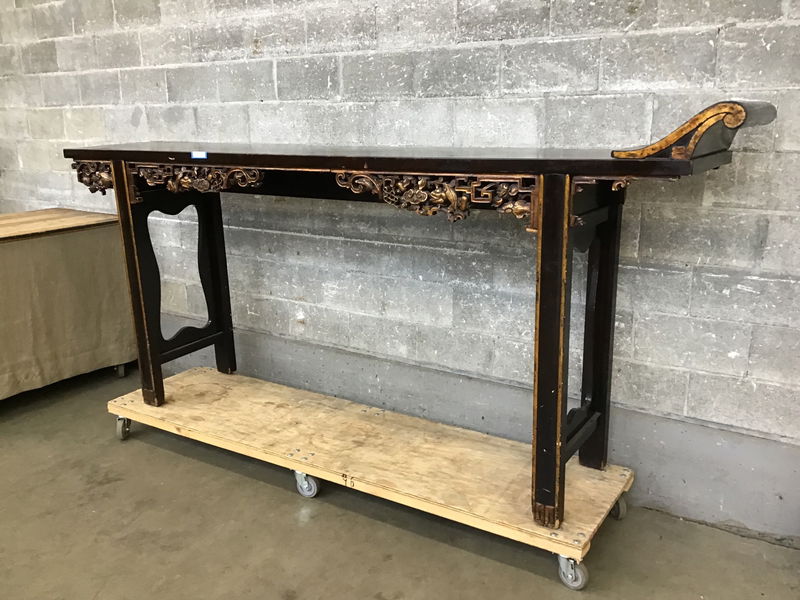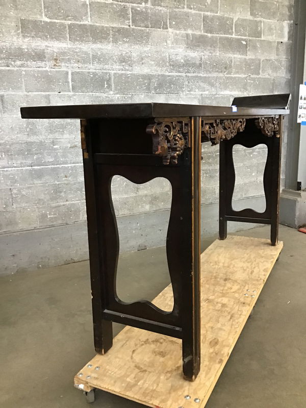 This interesting bar of sorts was previously used in a production at the 5th Avenue Theatre and is now ready for a more permanent home. Some of the distressed gold finished trim is missing or damaged, but for the most part this is a pretty nice looking piece with minimal wear and tear. There is a curvy piece of trim on one end (adds 6" to listed height) - it looks like there may have been a matching piece on the other end at some point. Could be a nice bar height table for extra tall friends or extra tall bar stools.