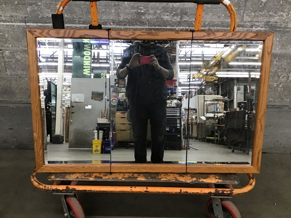 Classic oak framed medicine cabinet with beveled mirrors, 3 doors, and 2 shelves. Nice hinges, ready to install. Doors overhang box by about 1" all the way around.