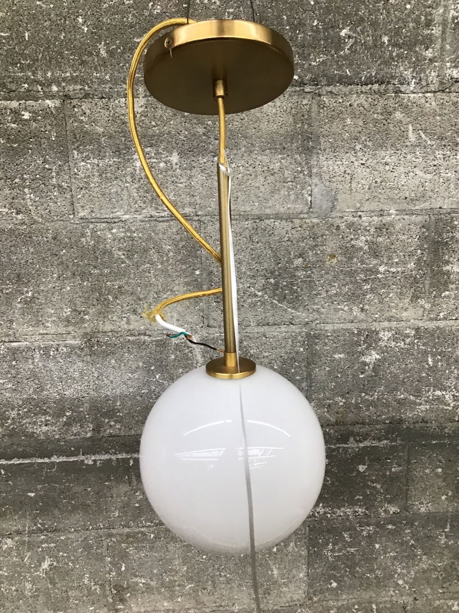 This is a hanging pendant light from West Elm with an antique brass finish to the canopy and the stem, a white glass bowl shade over the light, and a braided gold cord that can be adjusted to lower it by a few inches. Sells new at West Elm for $60.
