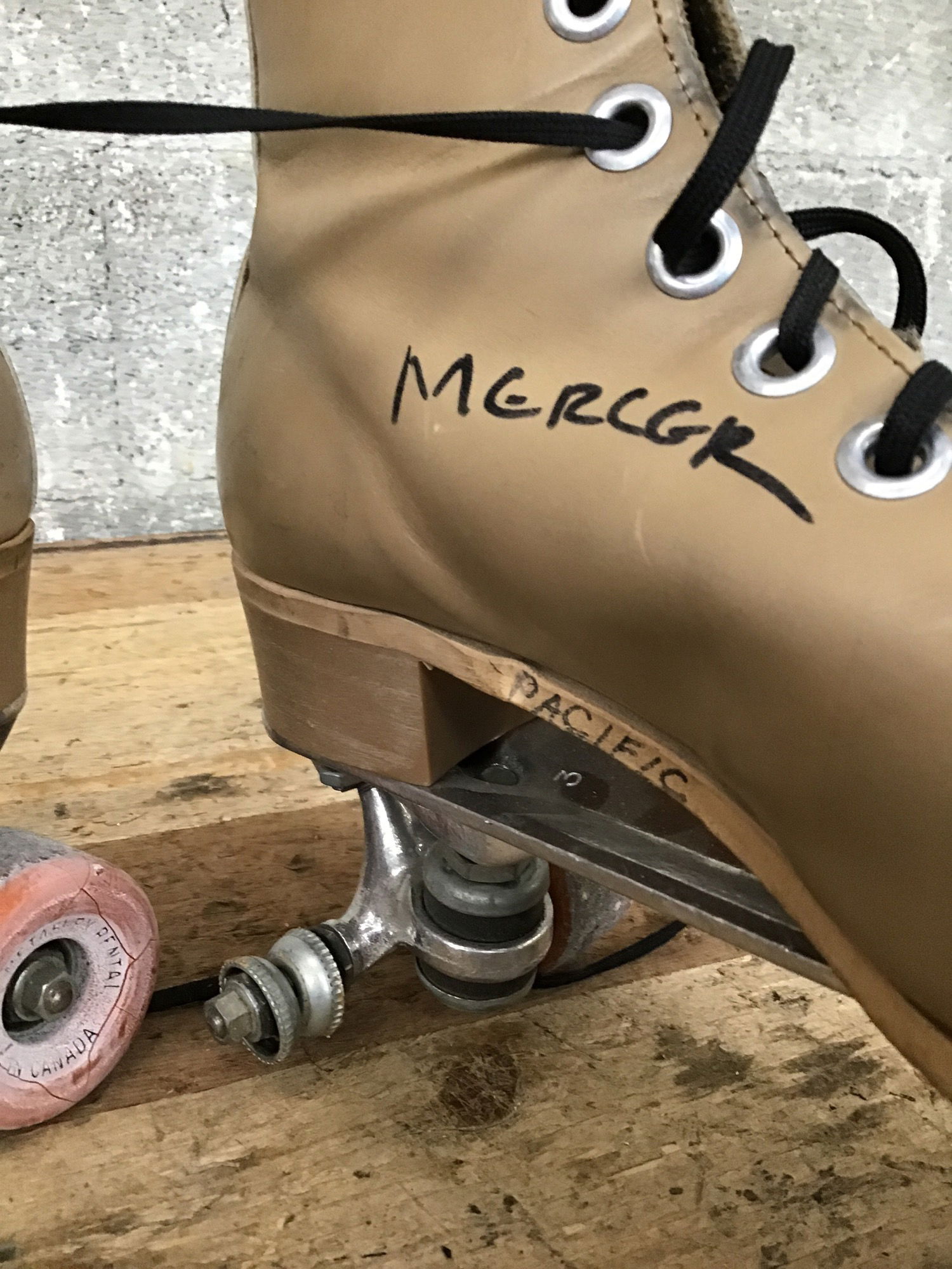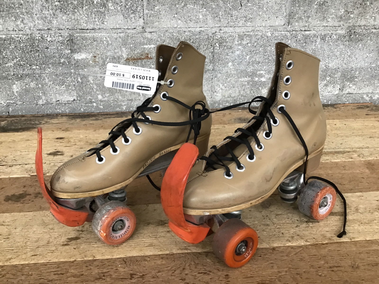 Vintage brown leather roller skates, size 8. Salvaged from a local school. The leather is in good condition, and there is cosmetic wear throughout from years of use. Being rental skates they have the size printed on the back. Bright orange wheels and stoppers. This pair does have Mercer written in marker on the inside of the right foot, and is missing the back right wheel on the left foot.