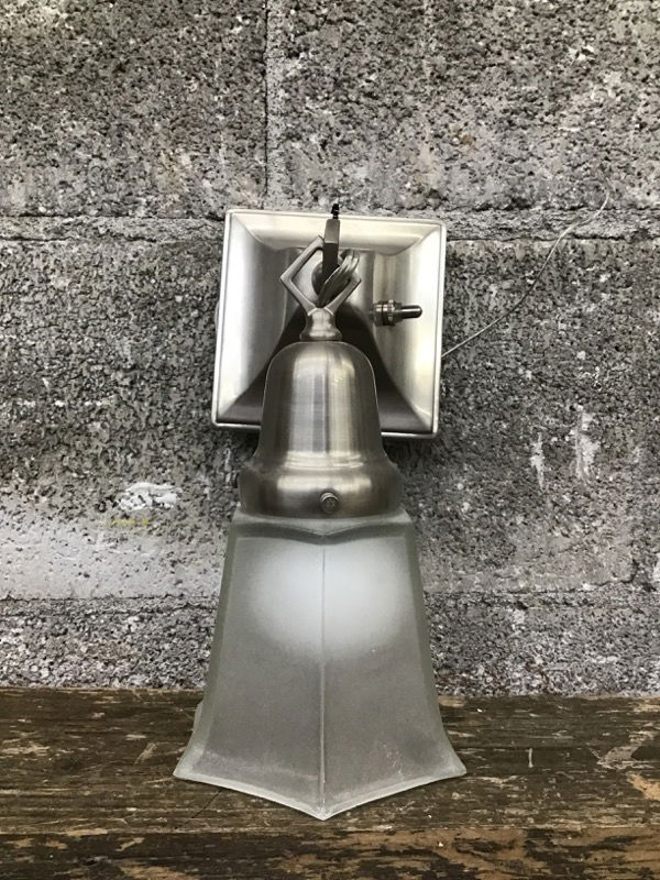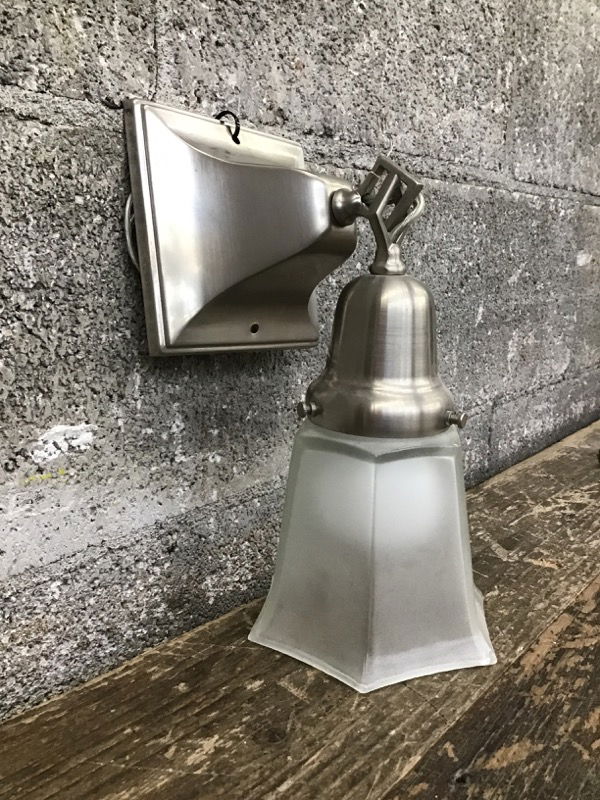 Brushed nickel wall sconce from Rejuvenation. Reminiscent of Mission style lighting with a few modern additions. There is a switch for operation on nickel housing. Suitable for damp locations such as a bathroom. Does not come with mounting hardware.