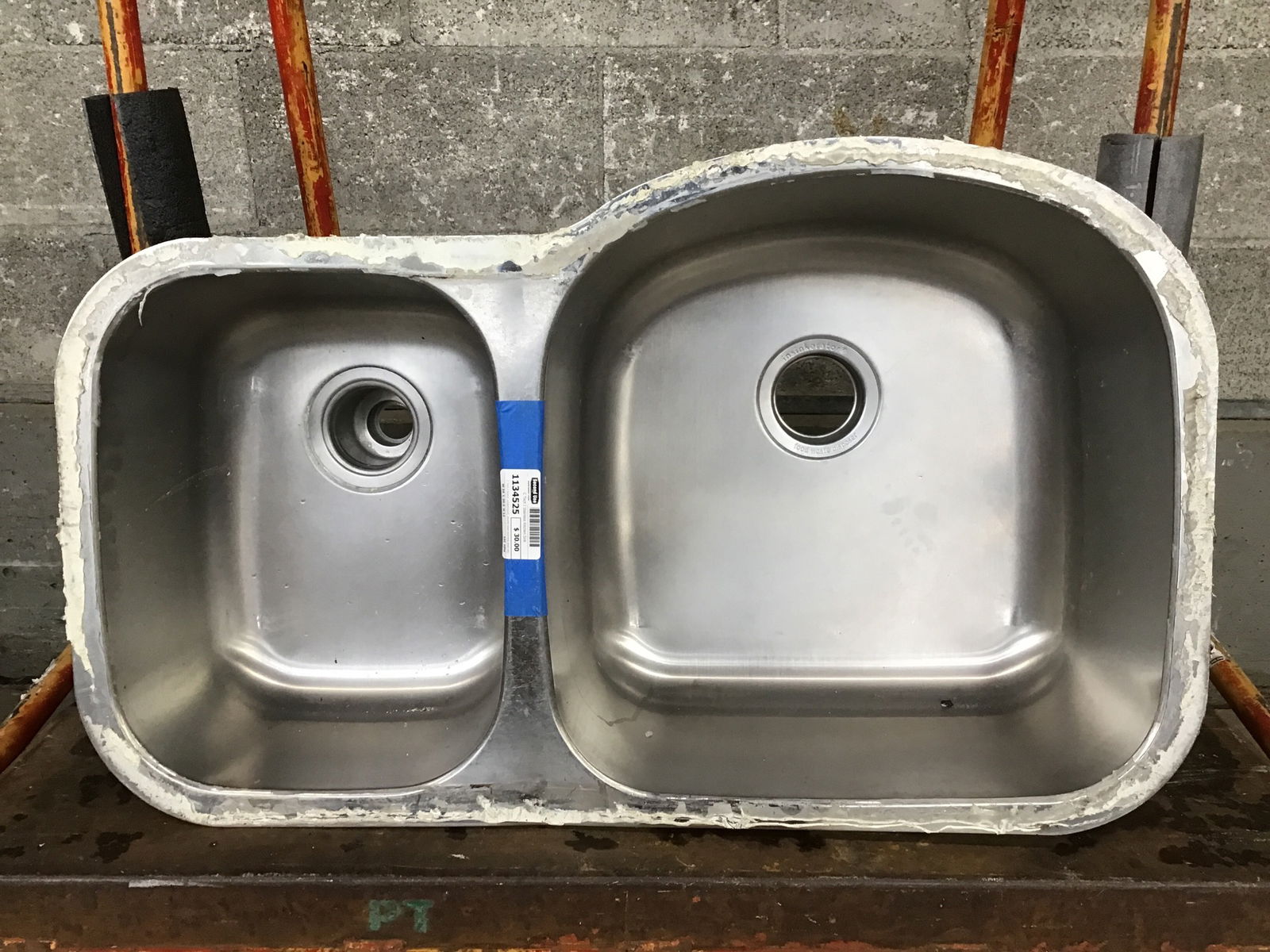 C Tech I brand, undermount, double bowl stainless steel kitchen sink made in 2005. It's got all the gunk on the rim from being a previously installed undermount sink, but scrape that off and it's ready to be reinstalled. Some minor scratches and a small dent from previous use. Includes basin racks and sink stopper.