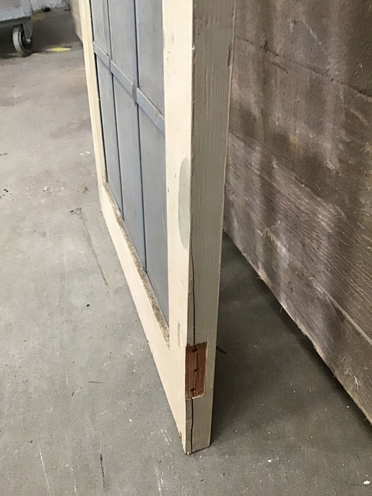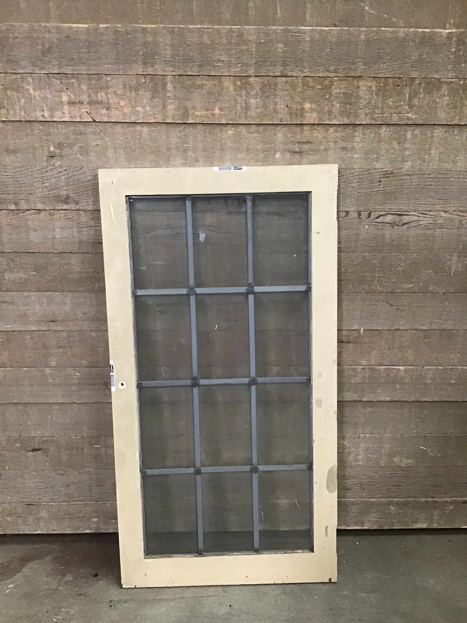 Vintage cabinet door with 12 bevel glass panes and lead/zinc dividers. Has a bit of splitting around hinge screws.
