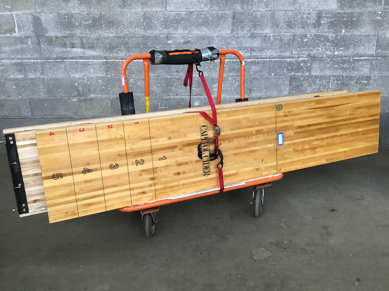 From a beloved local eatery, this shuffleboard half was made by Champion Shuffleboard in Richland Hills, Texas, meaning this shuffled board segment features solid maple construction and their signature 1/4″ thick “Lifetime Polymer” coating finish. Below the surface, you'll find four pairs of steel mounting brackets. On the surface, you'll see the Capitol Cider logo and the standard shuffleboard scoring system. This arrived with three other shuffleboard halves. Sans a little sand, this peice shows limited signs of wear. Dimensions do not include brackets. Pictured with other half; second half not included.