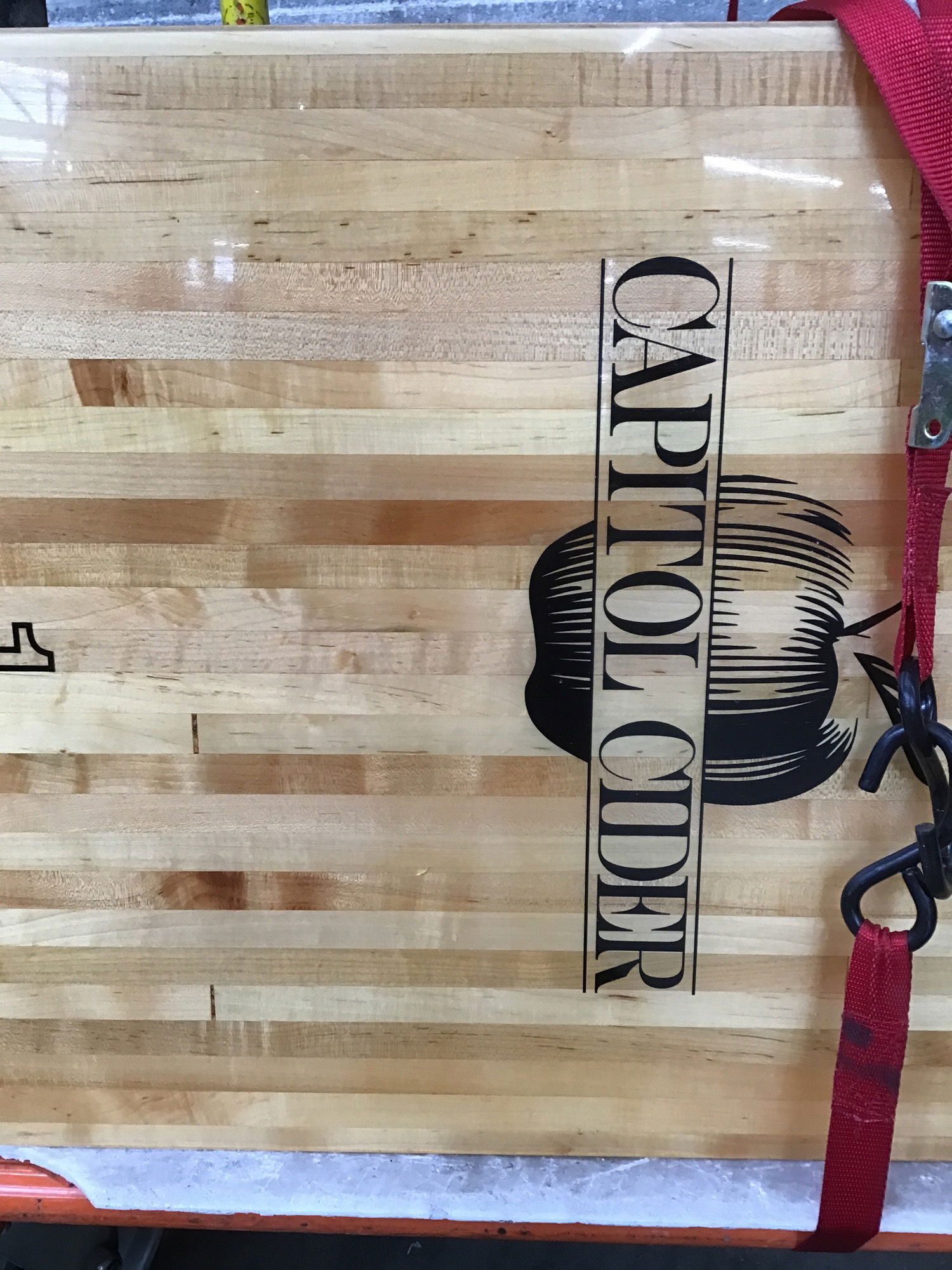 From a beloved local eatery, this shuffleboard half was made by Champion Shuffleboard in Richland Hills, Texas, meaning this shuffled board segment features solid maple construction and their signature 1/4″ thick “Lifetime Polymer” coating finish. Below the surface, you'll find four pairs of steel mounting brackets. On the surface, you'll see the Capitol Cider logo and the standard shuffleboard scoring system. This arrived with three other shuffleboard halves. Sans a little sand, this peice shows limited signs of wear. Dimensions do not include brackets. Pictured with other half; second half not included.