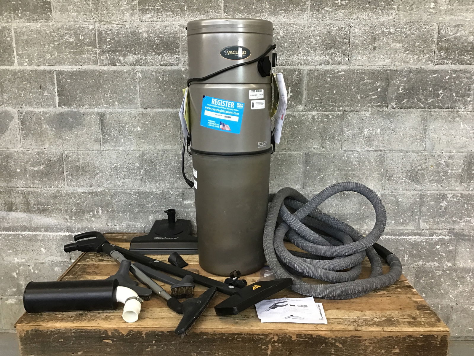 Vacuflo FC650 central vacuum system with some accessories. The vacuum canister worked when we tested it. (You have to "jump" the plug attachment to make it work. It should work fine once you install wall outlets and it's wired in.) The FC stands for filtered cycloning. Looks like the canisters start at $879 online.