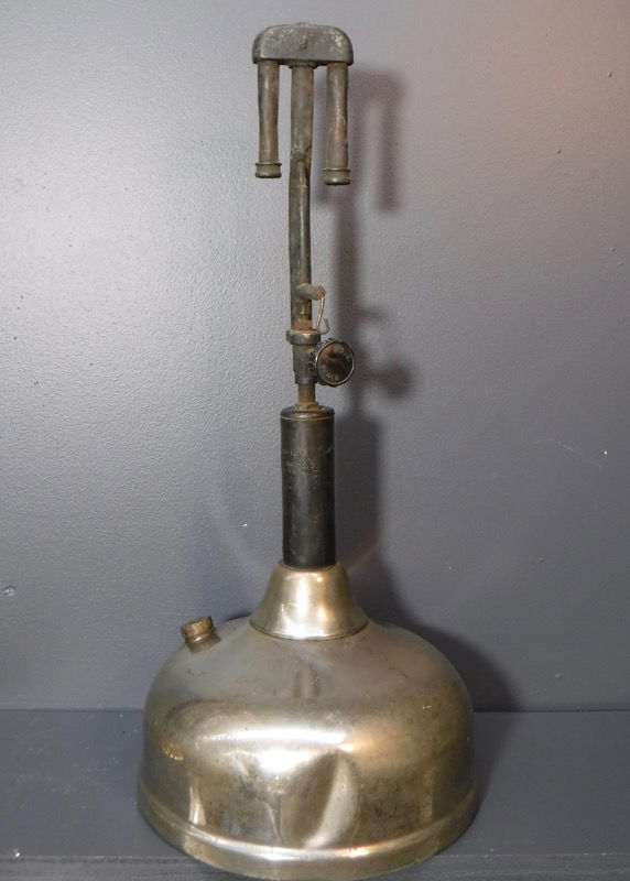 A vintage 1919 Coleman Quick-Light kerosene table lamp. Has a dent in the resevoir, and is lacking the shade and the bracket that would have held one on. Price reflects. Could be altered so that it could be electric, if you wanted, or leave it be as it just looks kinda cool as is.