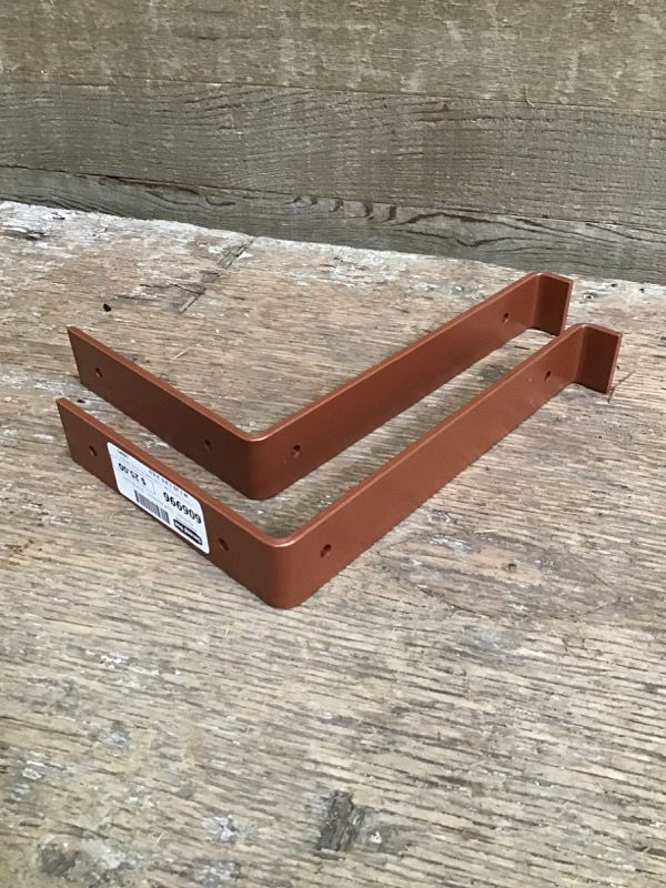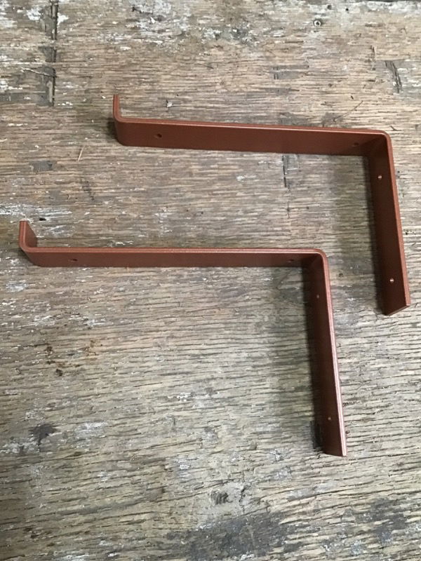 Custom shelf brackets, locally made by a family operation, comes in a copper powdercoated finish. Bent 3/16" steel with a lipped front. Made for a 9.25" wide board.