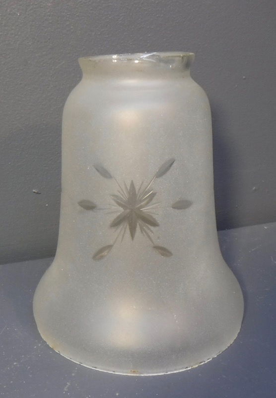 A lovely frosted glass shade from a gas lantern with a starburst pattern cut into it. In great shape for its age! Fits a 2-1/4" shade holder.