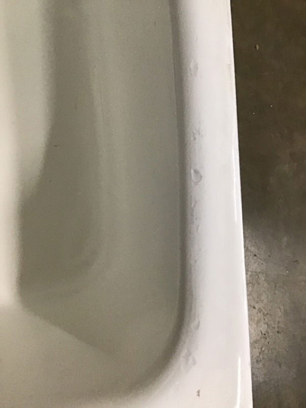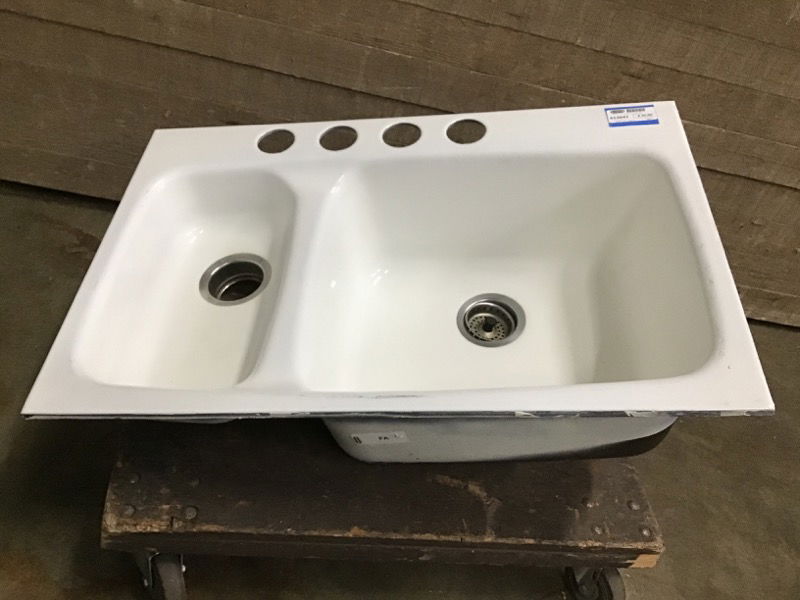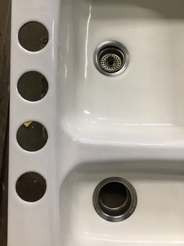 White enameled cast iron double basin sink, one is 9.5" deep and the other is 5", there are four sink holes. Along one edge of the bowl there are a few minor chips. Photos may be representational.