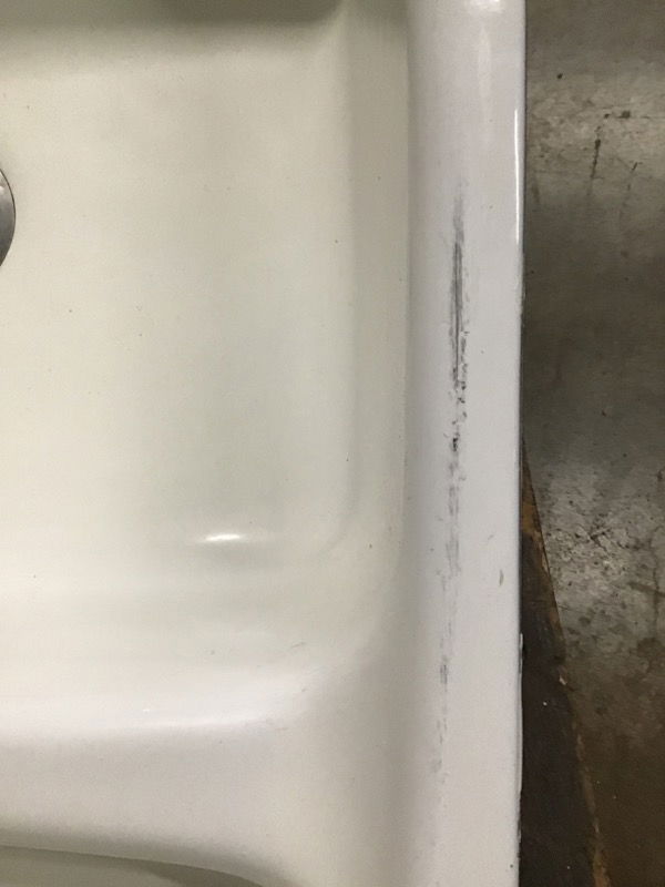 White enameled cast iron double basin sink, one is 9.5" deep and the other is 5", there are four sink holes. Along one edge of the bowl there are a few minor chips. Photos may be representational.