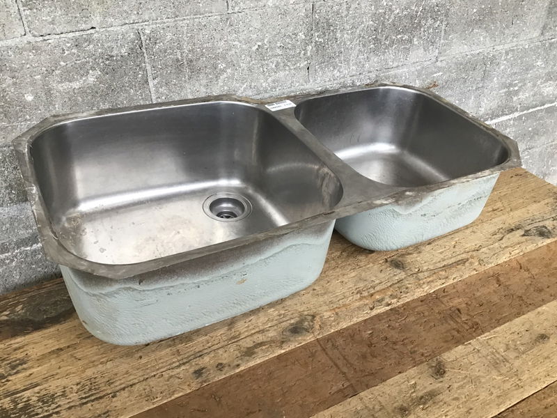 Cool little Franke stainless steel undermount. Bowls are two different sizes, looks really cool! Needs a good cleaning but otherwise in great shape.
