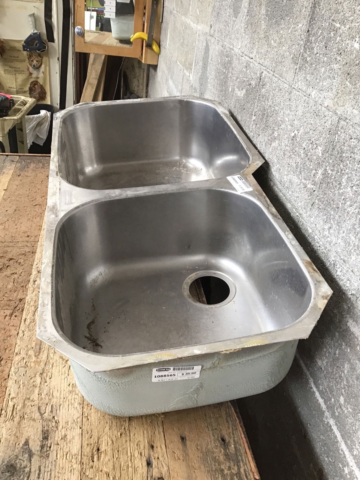 Cool little Franke stainless steel undermount. Bowls are two different sizes, looks really cool! Needs a good cleaning but otherwise in great shape.