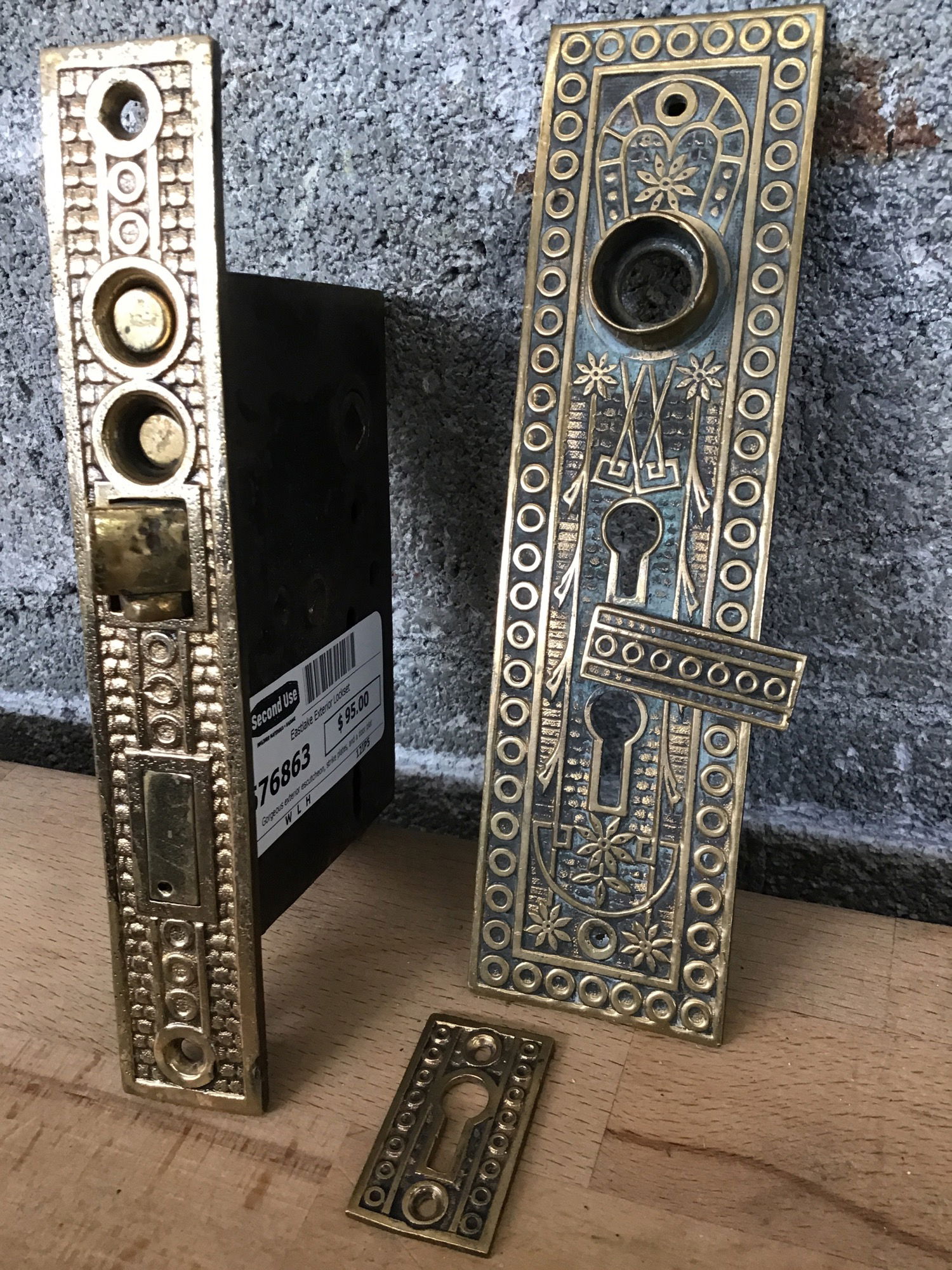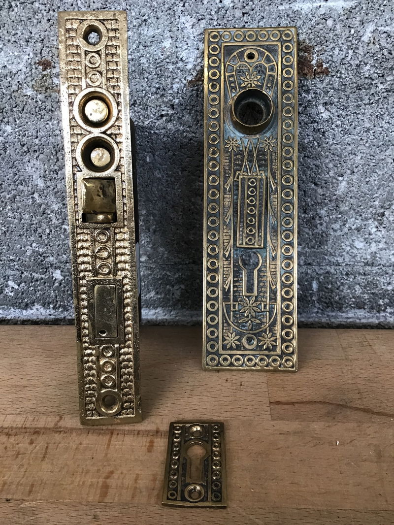 Gorgeous exterior lockset with pressed eastlake motif knobs, escutcheon, strike plates, and a door plate with secret keyhole hider!