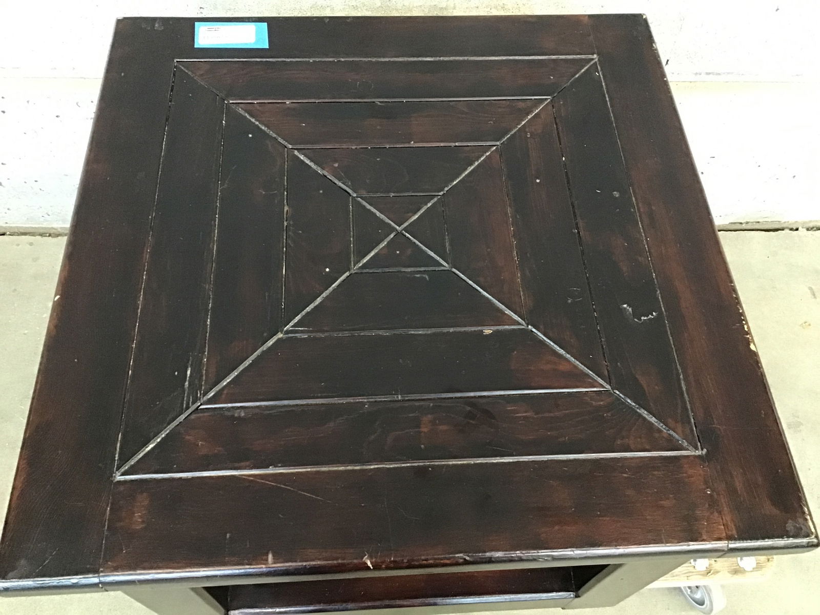 Dark stained heavy wood coffee table that has a neat geometric design carved into the top of it. It's got a few bumps and scratches but it adds to the charm of this piece.