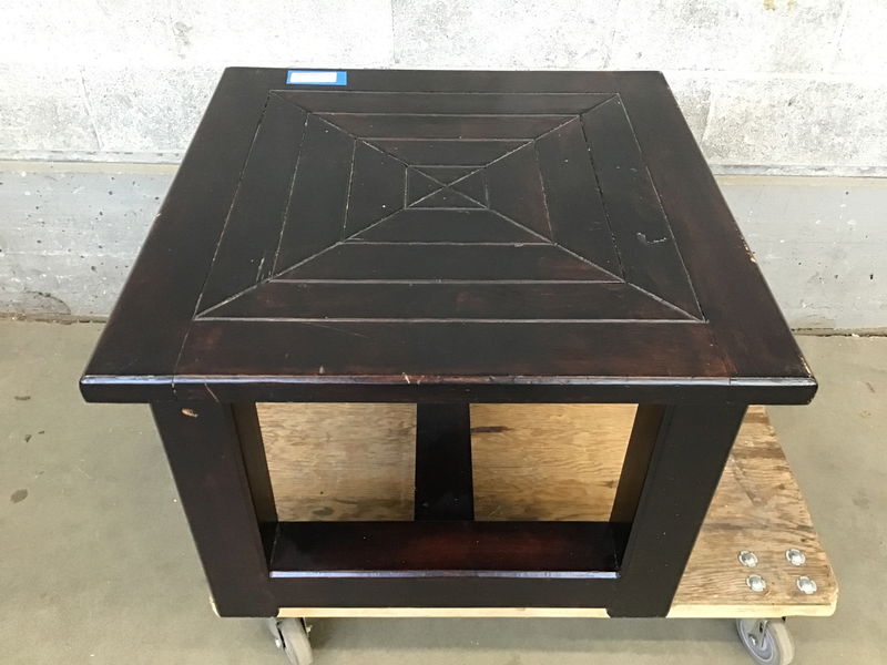 Dark stained heavy wood coffee table that has a neat geometric design carved into the top of it. It's got a few bumps and scratches but it adds to the charm of this piece.