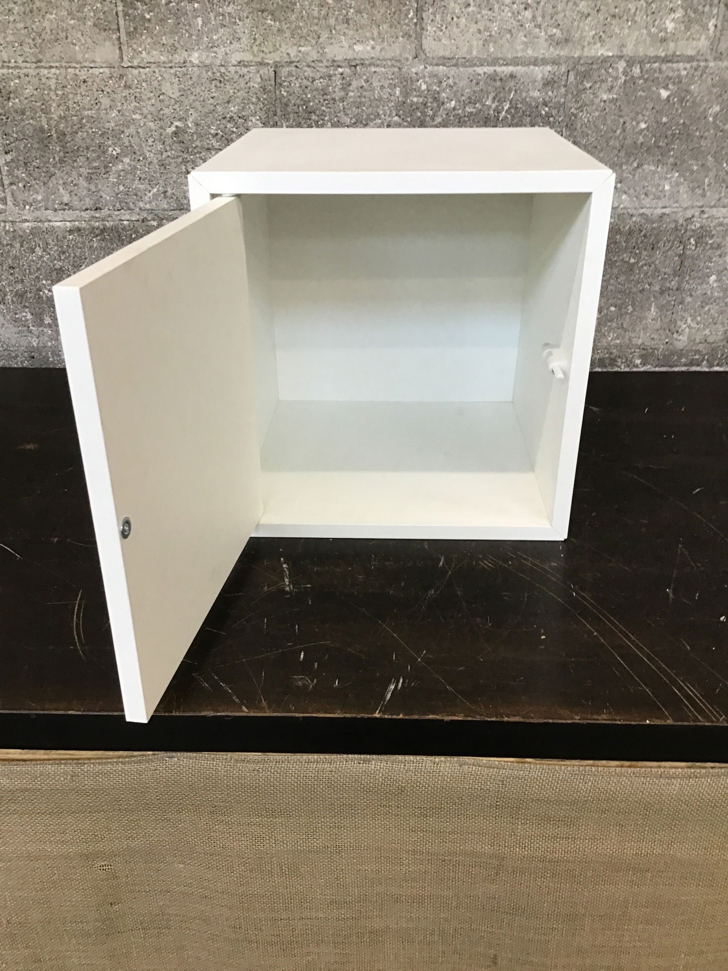 From IKEA, this EKET cabinet features particle board construction, a pop-open door, and a white finish. Limited wear from previous use.