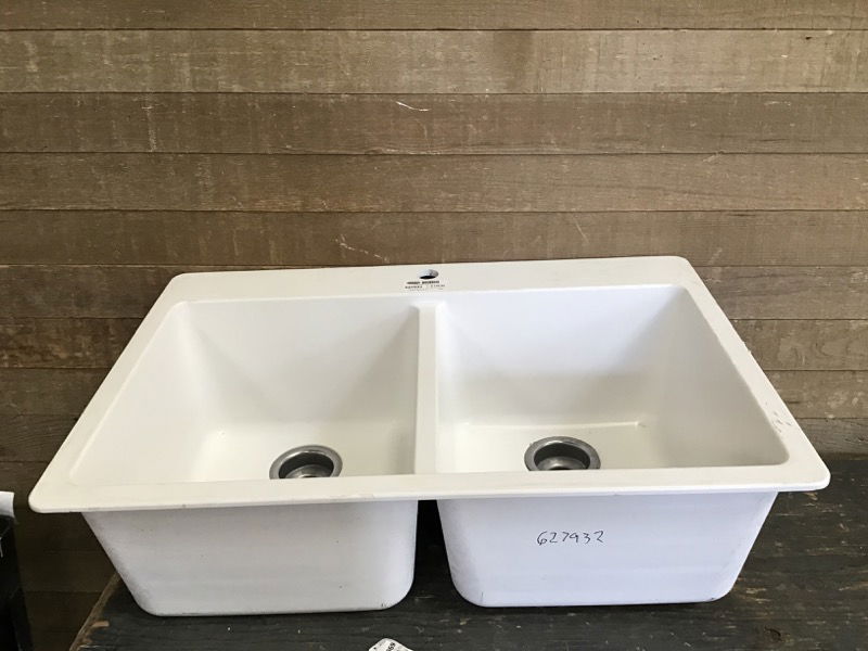 Nice white corian Elkay double basin undermount sink. It has some residue from the adhesive from it's previous life but is in good shape and ready to be used! These retail new for $473