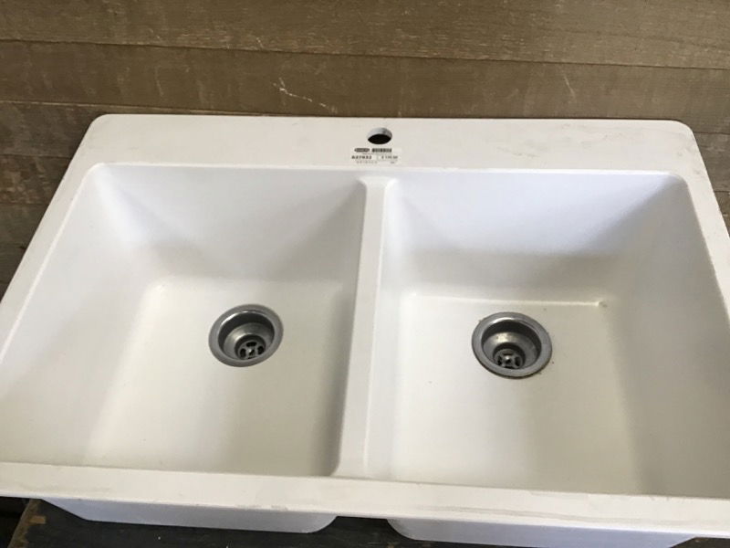 Nice white corian Elkay double basin undermount sink. It has some residue from the adhesive from it's previous life but is in good shape and ready to be used! These retail new for $473