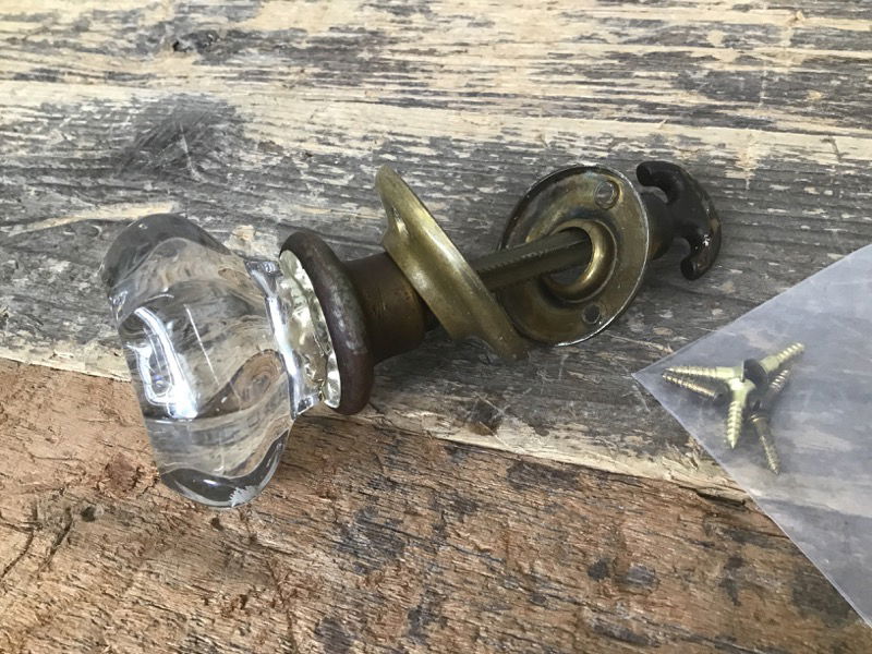 Glass knobset that features an octagon shaped, bulbous style, vintage glass knob on one side, and a thumb turn on the other. Includes matching door plates and had good set screws.