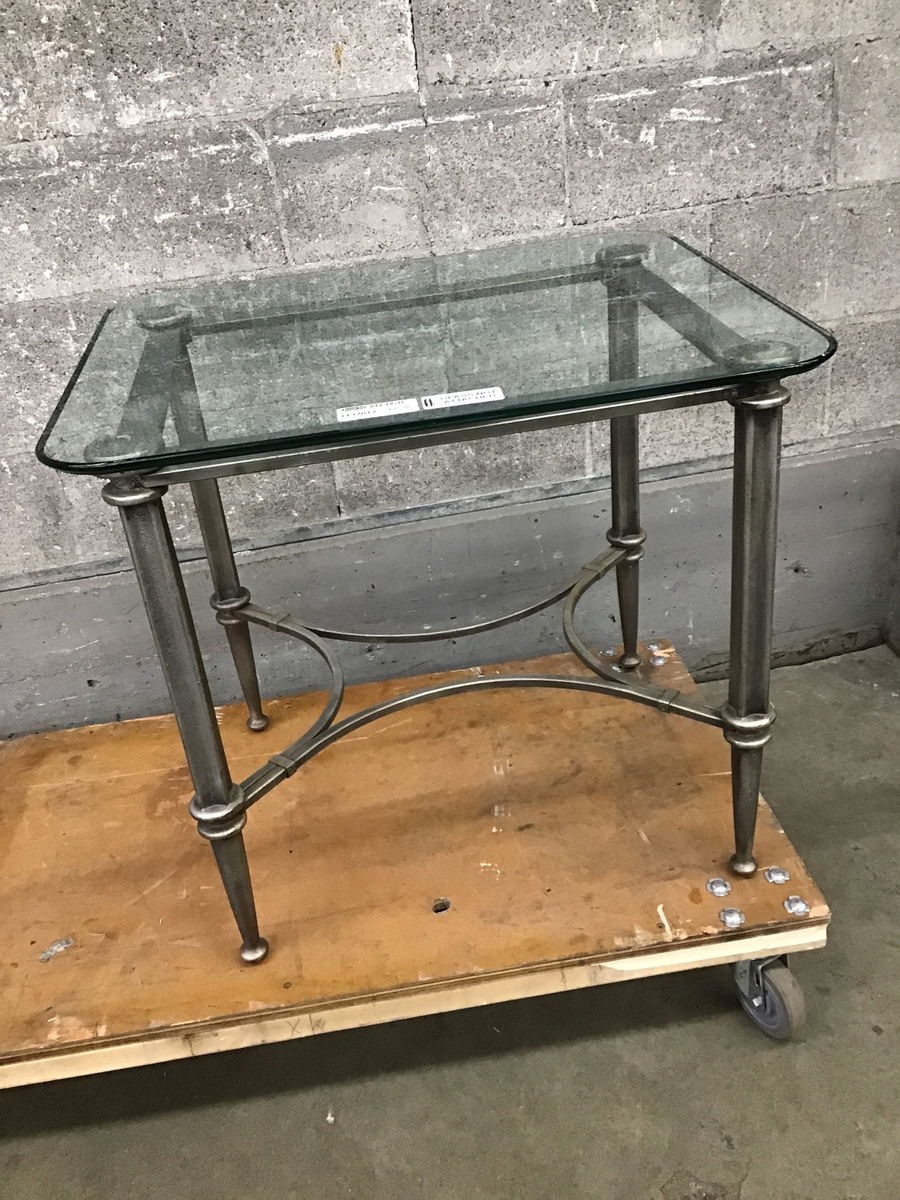 This side table features a steel frame, a weathered silver finish and tempered glass top. Glass top is not attached. Subtle wear to steel body.