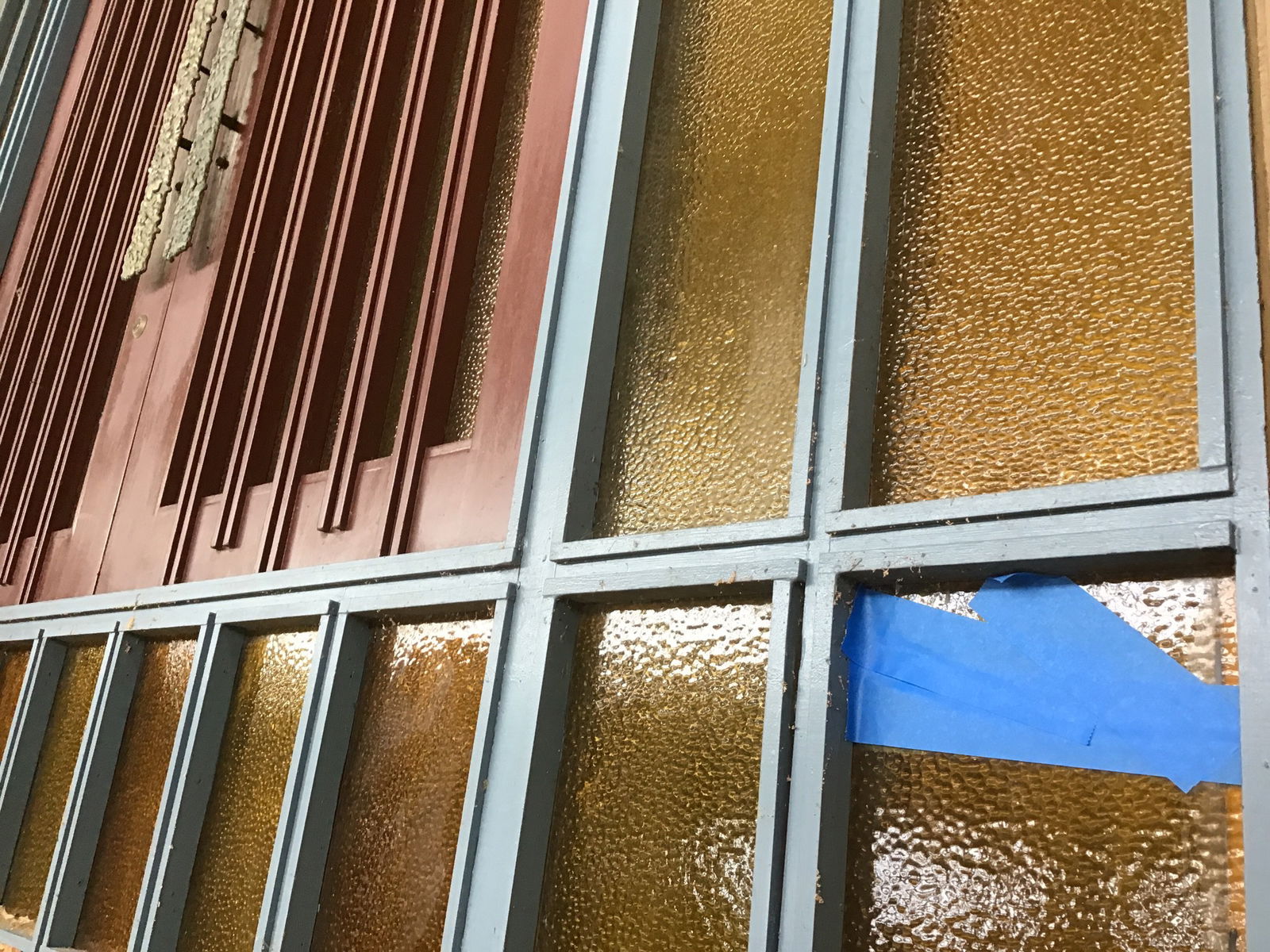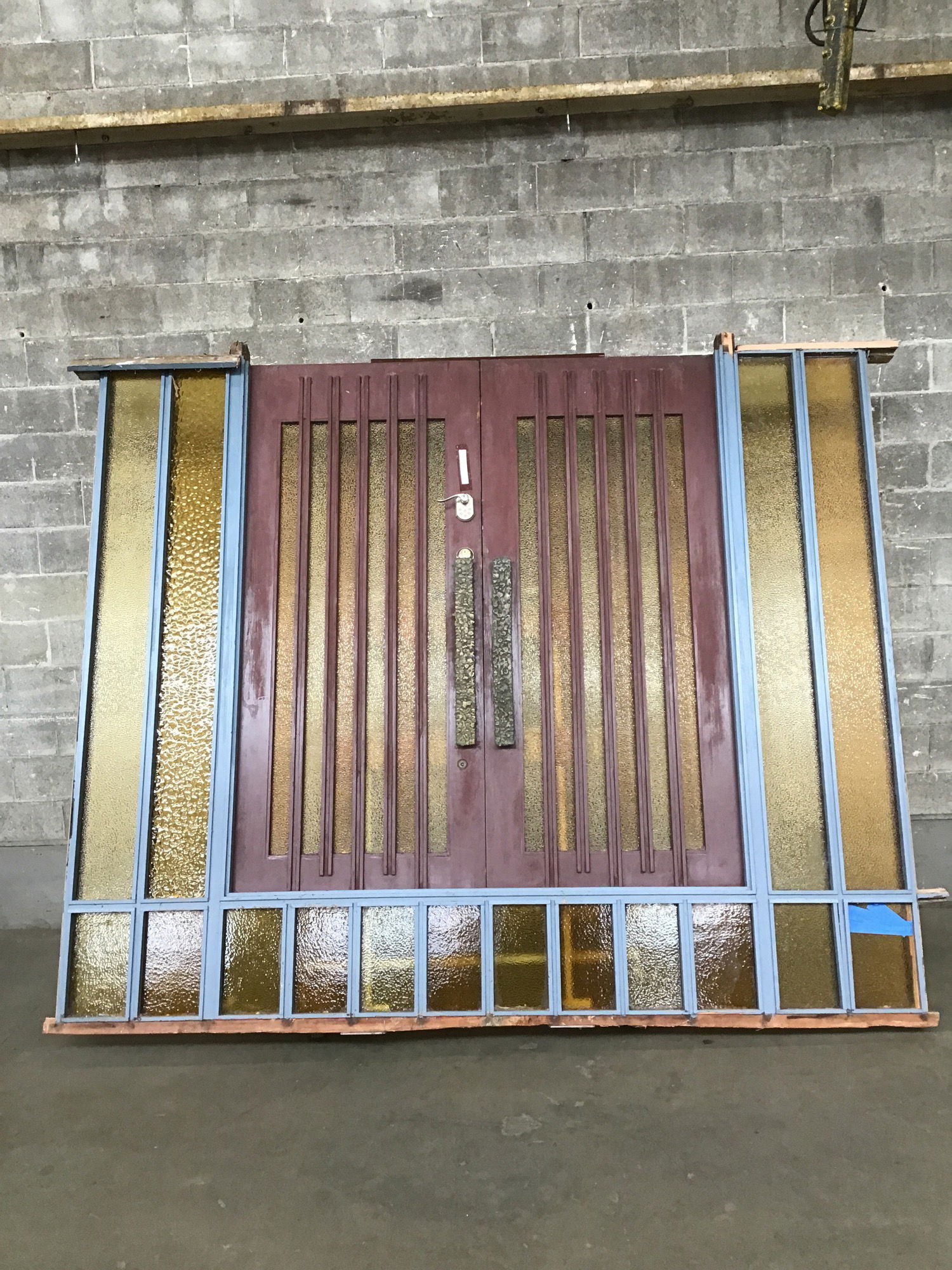 This absolute stunner of a front door is the kind of Mid-Century statement piece you could build an entire house around. Surrounded by textured amber glass panels, the double door at the center of this behemoth wears the same vertical glass in alternating light and dark shades, separated by grooved rails with whimsically alternating heights. Each door is punctuated by an awesomely textured cast brass handleset. There is a peephole and a modern handleset on one of the doors - the handleset is coded and at a weird height, which does detract a little bit from the look of this unit as a whole. You'll notice that one of the panes of glass is cracked, but don't worry! Our expert salvage team snagged a replacement piece of glass, so all you have to do is carefully swap it out. This is painted a deep, rich shade of brown on the interior and a combination of muted red and blue on the exterior. WOW!