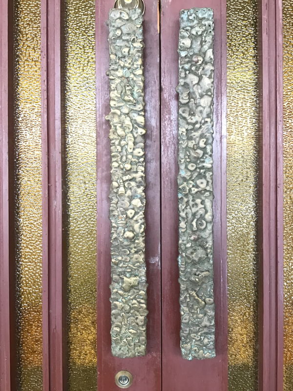 This absolute stunner of a front door is the kind of Mid-Century statement piece you could build an entire house around. Surrounded by textured amber glass panels, the double door at the center of this behemoth wears the same vertical glass in alternating light and dark shades, separated by grooved rails with whimsically alternating heights. Each door is punctuated by an awesomely textured cast brass handleset. There is a peephole and a modern handleset on one of the doors - the handleset is coded and at a weird height, which does detract a little bit from the look of this unit as a whole. You'll notice that one of the panes of glass is cracked, but don't worry! Our expert salvage team snagged a replacement piece of glass, so all you have to do is carefully swap it out. This is painted a deep, rich shade of brown on the interior and a combination of muted red and blue on the exterior. WOW!